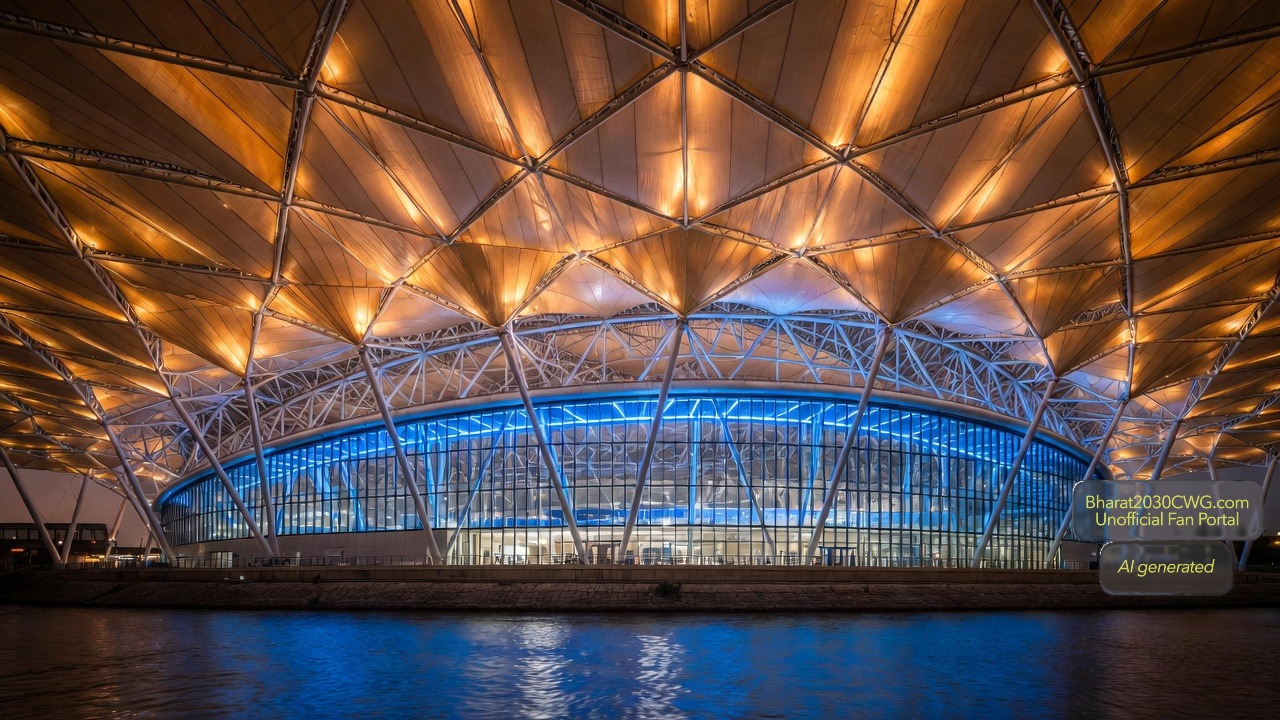 350-acre world-class hub along the Sabarmati River got its first major reveal: features include a new International Tennis Centre (10,000-seat main court), an 18,000-seat multi-purpose indoor arena, a landmark Aquatic Centre (up to 12,000 seats with Diwali lantern-inspired design), a National Institute of Sports Excellence, and a central Games Plaza that will transform into a public riverfront park after the Games. This is the heart of CWG 2030!